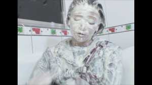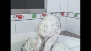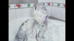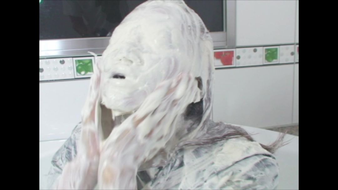 This is a scene of the continuation of MessyScene0106. The cream is put from the head on her.