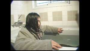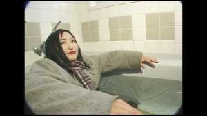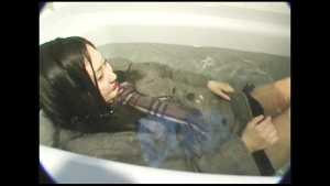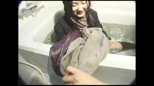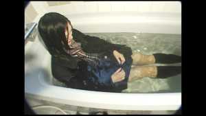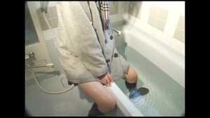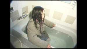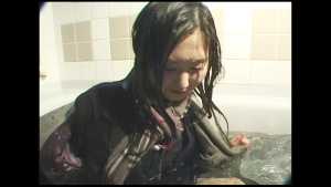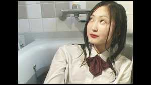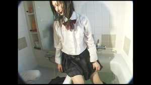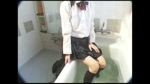 She wears student's uniform. In addition, the court also wears it. She is sprinkled water in the bucket, and is soaked to the bathtub. This is a scene of taking a picture of a sopping wet website in Japan.