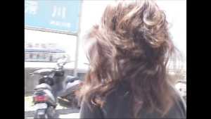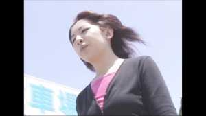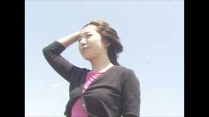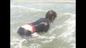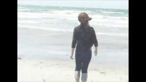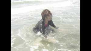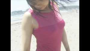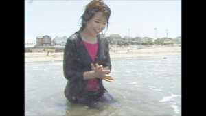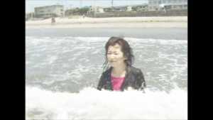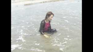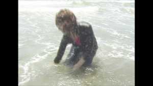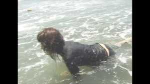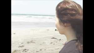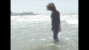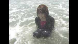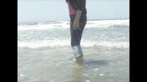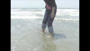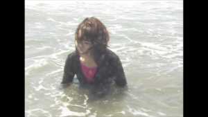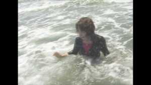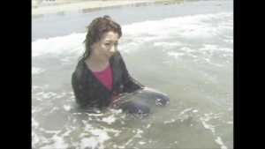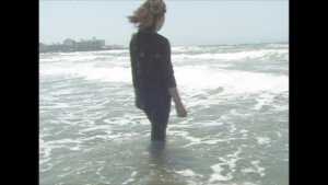 She is walking toward the sea. She is a T-shirt appearance in jeans. And, she enters the sea like clothes, and soaks.