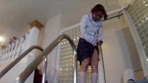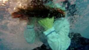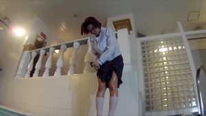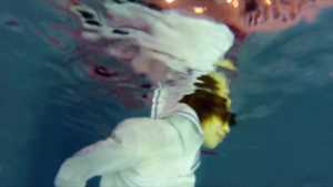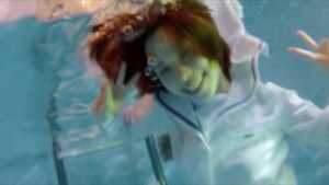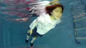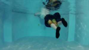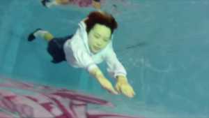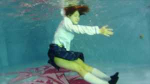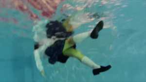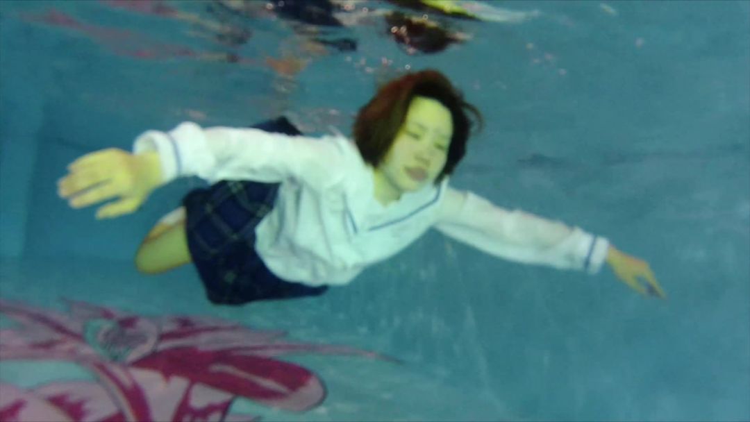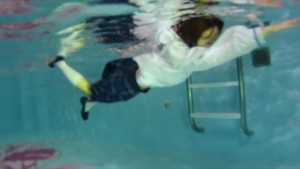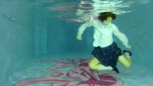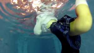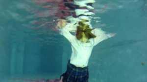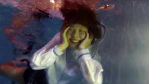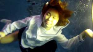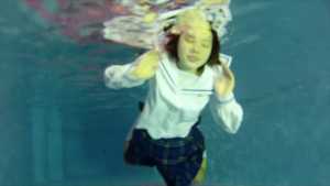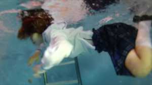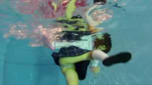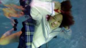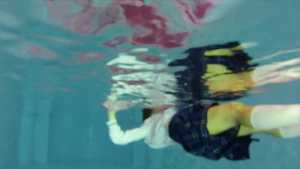 She is a good swimmer. She jumps into the pool in her school uniform and enjoys herself. She looks like she has a lot of fun in the water.